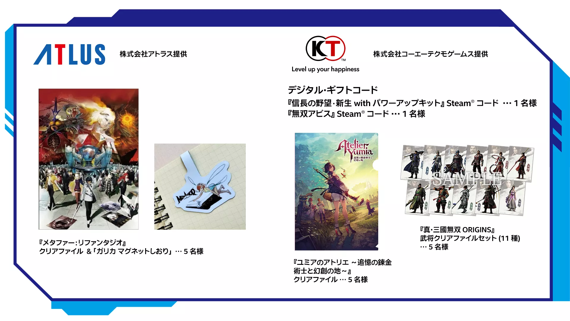 株式会社コーエーテクモゲームス提供 『信長の野望・新生 with パワーアップキット』 Steam コード … 1 名様 『無双アビス』 Steam コード … 1 名様 『ユミアのアトリエ ~追憶の錬金術士と幻創の地~』クリアファイル … 5 名様 『真・三國無双 ORIGINS』武将クリアファイルセット (11 種) … 5 名様 |