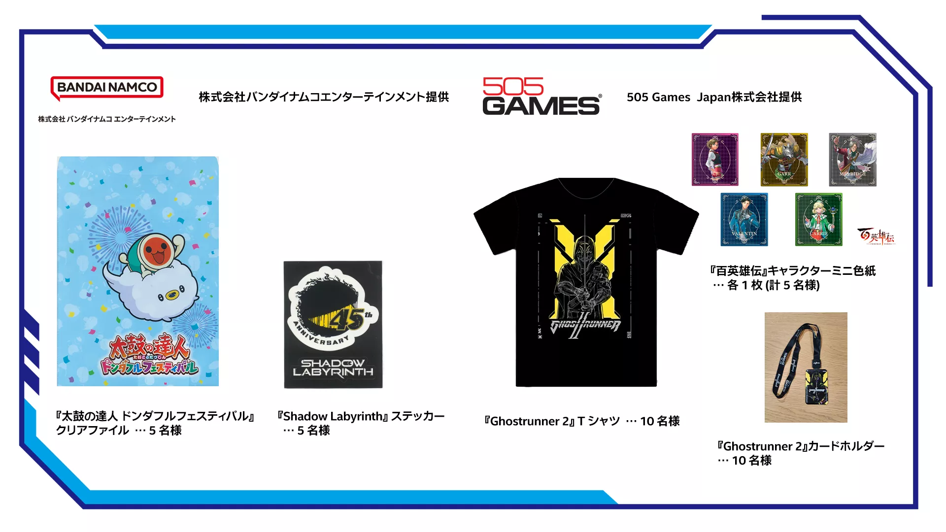 505 Games Japan株式会社提供 『Ghostrunner 2』T シャツ … 10 名様 『Ghostrunner 2』カードホルダー … 10 名様 『百英雄伝』キャラクターミニ色紙 … 各 1 枚 (計 5 名様) |