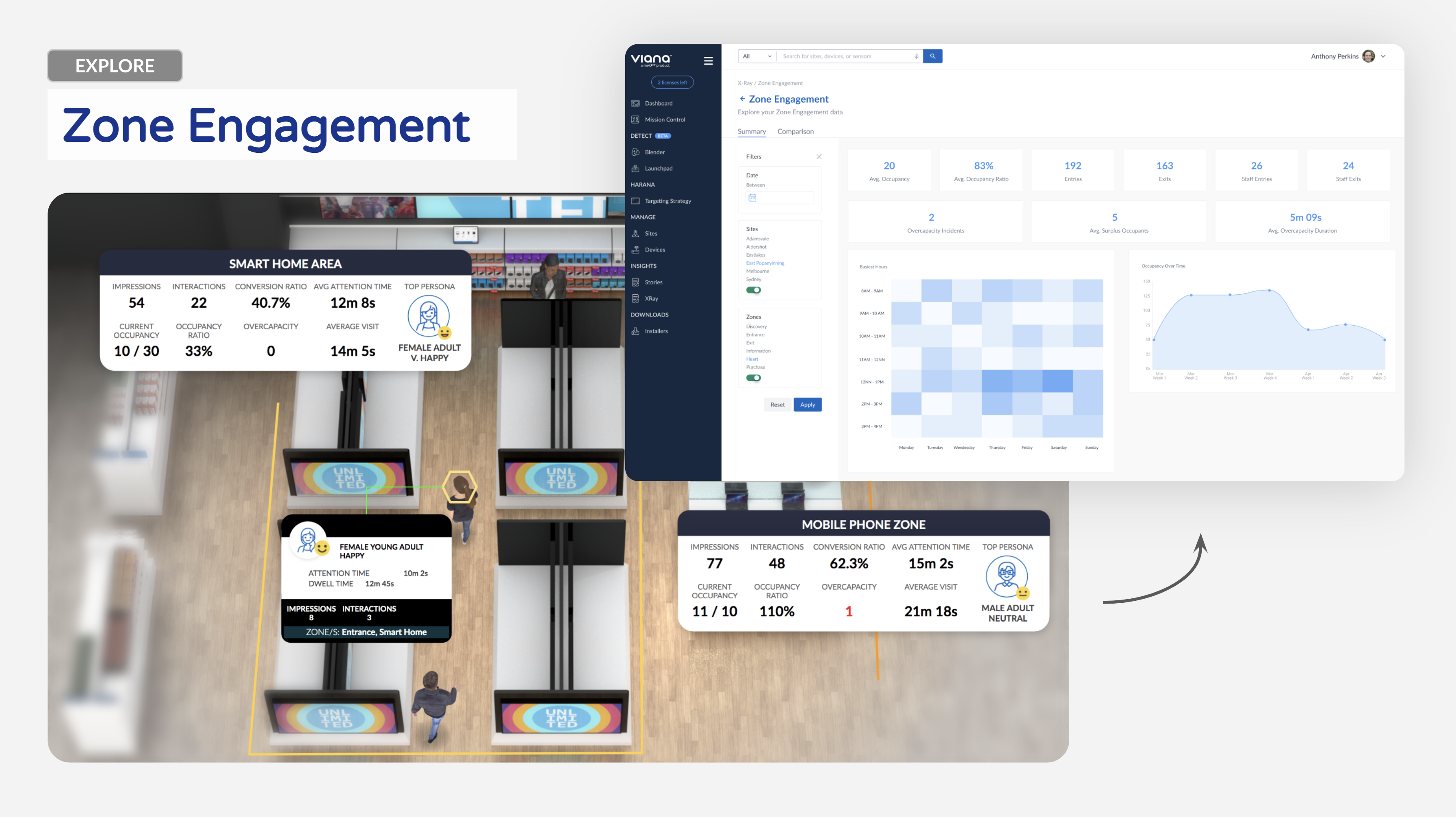 Viana™ (Vision Analytics の略) により、開発者がいなくてもマシンビジョンや AI データを消費できます。物理的な空間で人々がどのように働き、買い物をし、学習し、遊ぶのかを匿名で測定します。すぐに導入可能なさまざまなソリューションを用意しており、教育、セキュリティーなどのカスタム AI の使用事例もサポートできます。インテル® ディストリビューションの OpenVINO™ ツールキットの支援により、Viana は機械学習 (ML) の力を活用して、複雑な問題を解決し、プロセスを自動化することができます。
