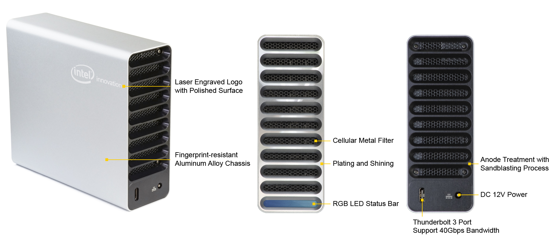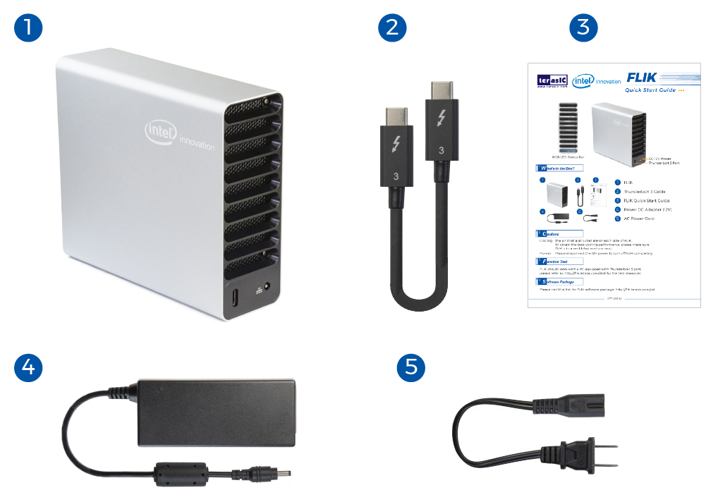 With the rapidly-rising demand in today’s AI and compute-intensive applications, Terasic’s FLIK (FPGA Client Innovation Kit) is a compact, all-in-one, adaptable accelerator purpose-design to accelerate critical workloads such as data analysis, deep learning, and machine learning algorithms directly on laptops or everything portable! With a form factor slightly larger than a 2.5'' external hard drive, it can be placed vertically or horizontally to blend into various size-demanding environment. FLIK takes advantage of the powerful Intel® Arria ® 10 FPGA to enable higher speed data processing. The kit is armed with 8GB DDR4-2133 on-board memory, providing around 4GB data transfer via PCIe Gen 3 interface between FPGA and laptops or Host PC via Thunderbolt™ 3 port. Also, closely packed in an aluminum body with advanced thermal solution, FLIK takes care of the heat dissipation dynamically.FLIK fully supports Intel® Open VINO™ Toolkit, Intel® Acceleration Stack, and OpenCL in both Linux and Windows versions. Our clients can achieve highest computing performance, adaptability and lowest cost across broadest range of AI and Deep Learning workloads.