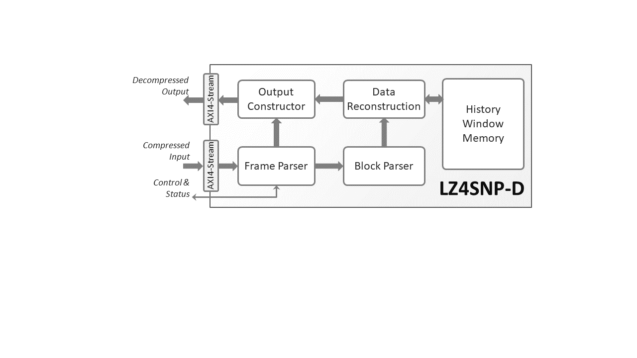 LZ4SNP-D is a custom hardware implementation of a lossless data decompression engine for the LZ4 and Snappy compression algorithms. The core receives compressed files, automatically detects the LZ4 or Snappy format, and outputs the decompressed data. The core features fast processing with low latency and high throughput. In its default configuration, LZ4SNP-D outputs 7.8 bytes of decompressed data per clock cycle and can be clocked at frequencies exceeding 250MHz on Intel® Arria® 10 devices. Designers can scale the throughput by instantiating the core multiple times to achieve throughput rates exceeding 100Gbps. The processing latency is approximately 30 clock cycles.The decompression core operates on a standalone basis—offloading the host CPU from the demanding task of data decompression—and has been designed for easy integration and use. No preprocessing of the incoming compressed files is required, as the core parses the file headers, checks the input files for errors, and outputs the decompressed data payload. Extensive error tracking and reporting enable the core to ensure smooth system operation and error recovery, even in the presence of errors in the compressed input files. Furthermore, internal memories can optionally support Error Correction Codes (ECC) to simplify achieving enterprise-class reliability or functional safety requirements.