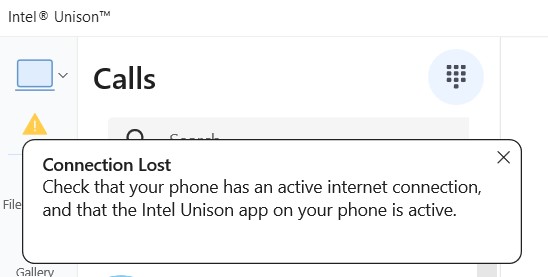 PCアプリと電話アプリの両方がインターネットに接続インテル® Unison™が、開くときに 接続が失われ ましたというプロンプトが表示される場合。